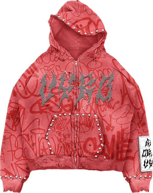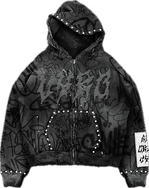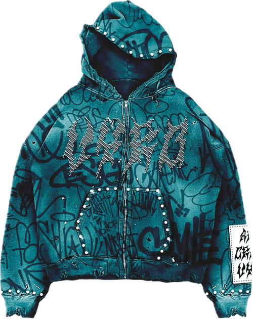 The Teal VYRO Zip Hoodie blends raw street energy with bold detail. Designed with an all-over graffiti print, this piece stands out with rhinestone VYRO lettering across the chest and stud accents lining the hood, pockets, and cuffs. Finished with a cropped fit and distressed edges, it delivers a worn-in look with a luxury street feel.